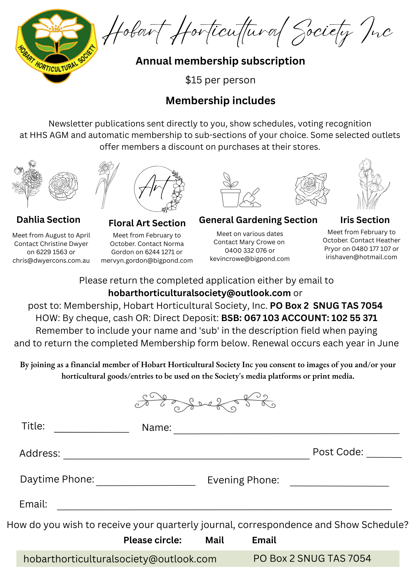 Below you will find a printable version of our membership form if you would like to join the Society, or you can contact the Membership Officer on hobarthorticulturalsociety@outlook.com and a copy can be mailed electronically or by post at your request.